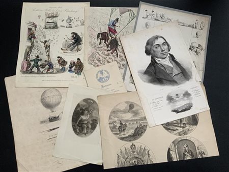 [AERONAUTICA] Lotto di diverse stampe e illustrazioni del XIX secolo dedicate alle mongolfiere e ai primi esperimenti aerei. Non collazionato e difetti da esaminare.