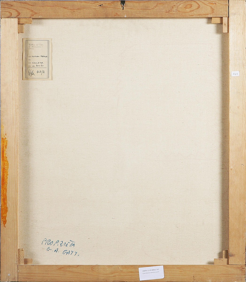 PAPOLA CLAUDIO (n. 1937) Senza titolo. Collage su tela. Cm 68,5x78,5. Al retro cartiglio descrittivo della Galleria del Vetro, Milano.