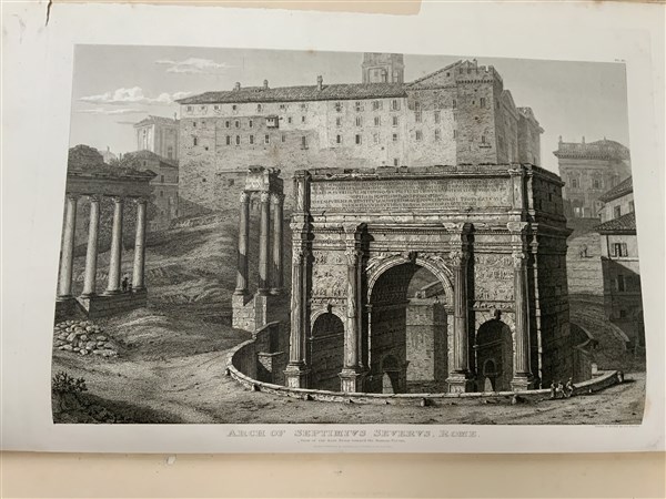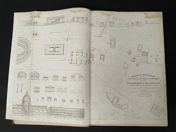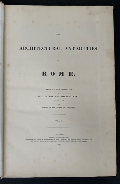 [ARCHEOLOGIA] TAYLOR George Ledwell, CREASY Edward. The Architectural Antiquities of Rome. 1821-1822. 2 volumi, Folio, 129 tavole fuori testo, alcune a doppia pagina e ripiegate. Legatura del XIX secolo in tela con titolo su tassello al dorso (pagine di testo brunite, fioriture, ultime carte del II volume con macchia d'umidità al margine superiore). Non collazionato e difetti da esaminare.