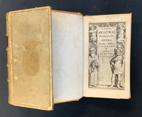 BOCCALINI Traiano. La Secretaria di Apollo. Amsterdam: Blum et Conbalense, 1653. 16mo (111x60mm) Antiporta figurata. Legatura del XIX secolo in piena pergamena alle armi, decori in oro. ex libris Puricelli Guerra [CON:] D. Magni Ausonii Burdigalensis opera. Amsterdam: Blaeu, 1669. 16mo, frontespizio inciso. Legatura coeva in piena pergamena con titolo su tassello al dorso. Non collazionato e difetti da esaminare.