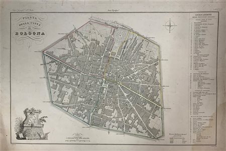 [BOLOGNA] - Pianta iconografica del territorio urbano di Bologna, disegnata da Giuseppe Pozzi ed incisa da Giacinto Maina. Da: Zuccagni Orlandini, Atlante geografico degli Stati Italiani. Firenze, 1845, tav. 21.