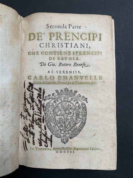 BOTERO, Giovanni. De' Prencipi Christiani, che contiene i Prencipi di Savoia. Torino: Domenico Tarino, 1603. 8vo, pergamena coeva, vignetta xilografica al frontespizio, iniziali e fregi (fioriture). Non collazionato e difetti da esaminare.