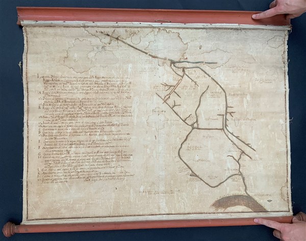 [CARTOGRAFIA] - Mappa catastale, Roggia Riazzola. 1711]. (600 x 830mm) Disegno su carta acquarellato e applicato su tela con supporti in legno colorato (lievi macchie e increspature). La mappa raffigura la Roggia Riazzola che alimenta i territori di Fallavecchia e Besate, all'epoca feudo della famiglia Visconti. Rivelavamento topografico eseguito dall'Ing. Giorgio Vitali.