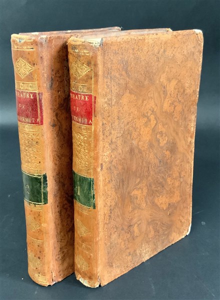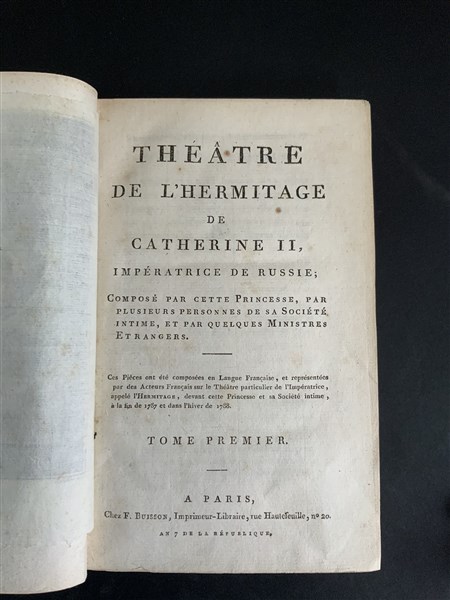 CATERINA II. Théâtre de l'Hermitage de Catherine II, impératrice de Russie, composé par cette princesse, par plusieurs personnes de sa société intime, et par quelques ministres etrangers. Parigi: Buisson, Gide. anno 7 1800]. 2 volumi, 8vo, Ritratto in antiporta inciso in rame da Tardieu (lievi fioriture) Legatura coeva in pelle marmorizzata con titoli dorati su tasselli al dorso decorato in oro. Prima edizione francese di questa raccolta di 19 commedie opera della zarina e dei suoi letterati di corte e rappresentate a corte nell'anno 1787-88.