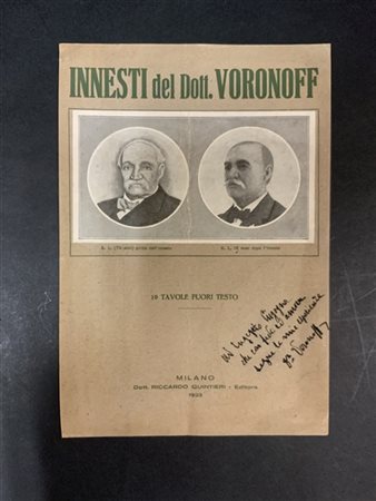 [CURIOSA] VORONOFF Serge (1866-1951) Dedica autografa su frontespizio c.a 1923]. Dedica del celebre Dottore, protagonista di discussi esperimenti sul ringiovinimento che gli procurarono fama e ricchezza. Nello specifico il Dott. Voronoff innestava frammenti di testicoli di Scimpanzè su testicoli umani promettendo rinvigorimento fisico. Nel corso degli anni '20 aprì numerose cliniche in Europa dove curò all'incirca 700 pazienti; per fornire la quantità sufficiente di testicoli di scimmia per le sue operazioni aprì una "fattoria" sulla riviera ligure a Ventimiglia.