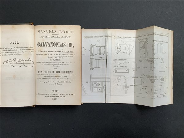 [DAGUERRE] - SMEE M., De Valicourt F. Nouveau Manuel complet de GALVANOPLASTIE, ou Éléments d'électro-métallurgie, contenant l'art de travailler les métaux à l'aide du fluide galvanique pour dorer, argenter, platiner,cuivrer etc. Parigi: Roret, 1843. 12mo, 2 tavole ripiegate. Dorso in pelle coeva (qualche brunitura). Raro e ricercato manuale, soprattutto per quel che riguarda il trattato di dagherrotipia, uno dei primi mai pubblicati
