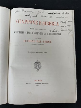 DAL VERME Luchino. Giappone e Siberia. Note d'un viaggio nell'estremo oriente al seguito di S.A.R. il Duca di Genova: Treves, 1885. Folio, numerose tavole, mappe e illustrazioni. Legatura coeva in mezza pergamena con titolo su tassello al dorso, brossura coeva conservata all'interno. Copia di presentazione di questo affascinante resoconto di una delle prime spedizioni moderne italiane in estremo oriente. Non collazionato e difetti da esaminare.