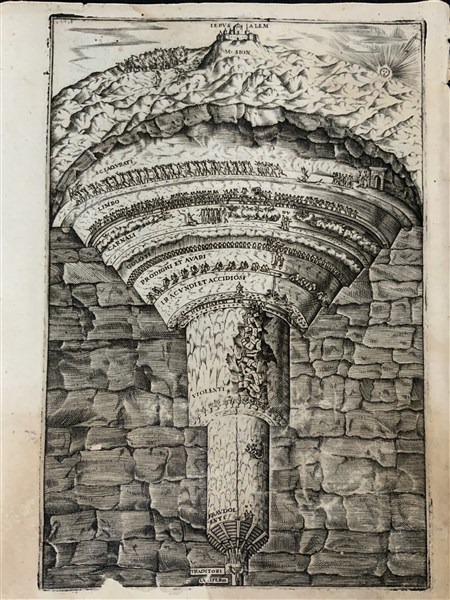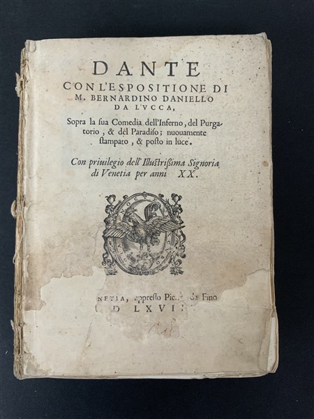 DANTE. Dante con l'espositione di M. Bernardino Daniello da Lucca, sopra la sua Comedia dell'Inferno, del Purgatorio, & del Paradiso. Venezia: Pietro da Fino, 1568. 4to (200 x 145mm). Marca tipografica al frontespizio e in fine volume, capilettera figurati xilografici, testo in corsivo circondato dal commento, 3 tavole incise in rame a piena pagina all'inizio di ciascuna cantica. Completo, danni da macchia umido ai margini inferiori con qualche perdita soprattutto al frontespizio e al colophon, restauri alle prime carte, privo di legatura. Copia da restaurare ma completa di questa prima e unica edizione della Commedia corredata dal commento di Bernardino Daniello con le 3 famose illustrazioni della disposizione dell'Inferno, del Purgatorio e Paradiso.
