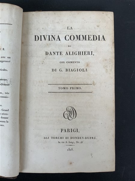 DANTE. La Divina Commedia. Parigi, Londra: Biagioli, 1818. 8vo, 3 voll. Legatura coeva in piena pelle con titoli e decori in oro al dorso. Provenienza: ex libris araldico Thomas Baring. Non collazionato e difetti da esaminare.