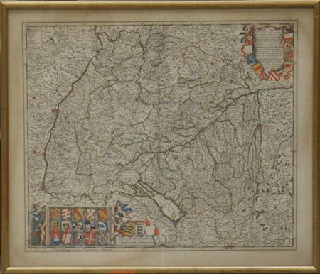 DE WITT, Frederick. S. R. I. Sueviae circulus et ducatus. Amsterdam: I. Covens e C. Mortier, fine XVII secolo. Mappa colorata a mano nei contorni all'epoca (550 x 650mm) (leggermente brunita nei margini) Venduta in cornice e vetro