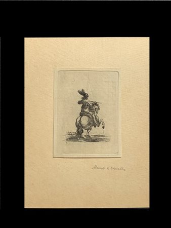 DELLA BELLA Stefano. Uomo a cavallo. Incisione calcografica (80x58 mm) applicata su cartoncino
