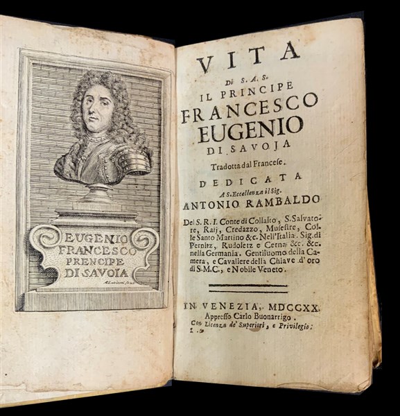 [EUGENIO DI SAVOIA] Vita di Francesco Eugenio di Savoia. Venezia: Carlo Buonarrigo, 1720. 8vo, antiporta incisa in rame. Pergamena coeva, titolo manoscritto al dorso[. Non collazionato e difetti da esaminare.