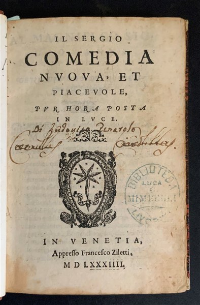 FENAROLI, Lodovico. Il Sergio comedia nuoua, et piaceuole, pur hora posta in luce. Venezia: Francesco Ziletti, 1584. Dorso in pelle del XVIII secolo con titolo in oro su carta marmorizzata. Note di possesso e timbro di collezione privata al frontespizio. Non collazionato e difetti da esaminare.