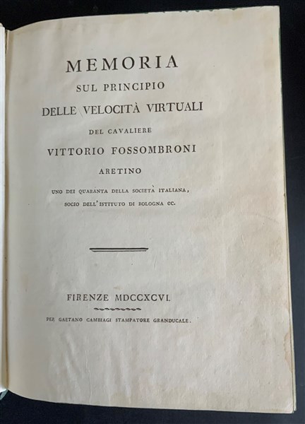FOSSOMBRONI, Vittorio. Memoria sul principio delle velocità virtuali. Firenze: