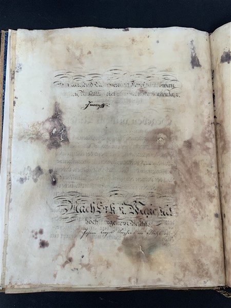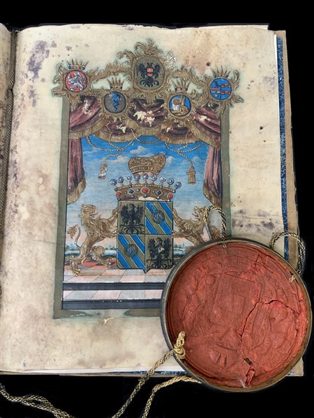 FRANCESCO II D'ASBURGO LORENA. Importante documento pergamenaceo firmato dall'Imperatore relativo alla famiglia Contarini. Vienna, [c.a. 1820]. 8 carte in pergamena, stemma dei Contarini miniato a piena pagina, grande sigillo in ceralacca entro contenitore in metallo, legatura in velluto. Pesantemente alluvionato, sigillo integro ma con frattura al margine superiore. Importante documento di nomina, non tradotto, indirizzato ad Alvise Contarini che nel 1821 venne nominato grande scudiere del regno lombardo-veneto e nel 1834 venne elevato al rango di gran Ciambellano del Regno. Importante testimonianza ancorchè danneggiata