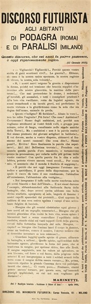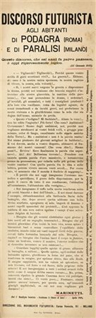 [FUTURISMO] - MARINETTI, Filippo Tommaso. (1876-1944) - Discorso futurista agli abitanti di Podagra (Roma) e di Paralisi (Milano). Milano: Taveggia, 1915]. Piccolo manifesto che riporta un testo tratto dal 2° Manifesto Futurista (pubblicato nel 1909). "Uccidiamo il chiaro di luna!” e ripubblicato per supportare l'intervento italiano nel primo conflitto mondiale. Il motivo della scelta del brano appare chiaro fin dall'incipit: "La guerra? ebbene sì, essa è la nostra unica speranza, la nostra ragione di vivere, la nostra sola volontà!". (480 x 148mm). Manifesto (segno di piegatura al centro, due sottolineature in pastello rosso, lievi fioriture).