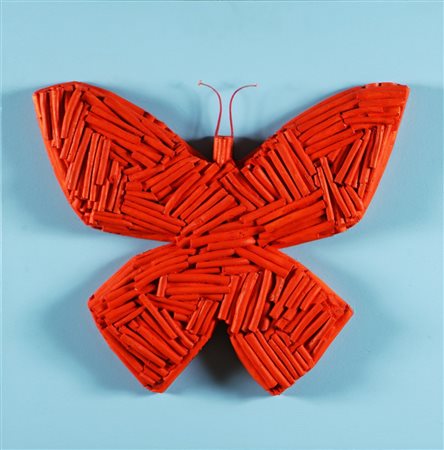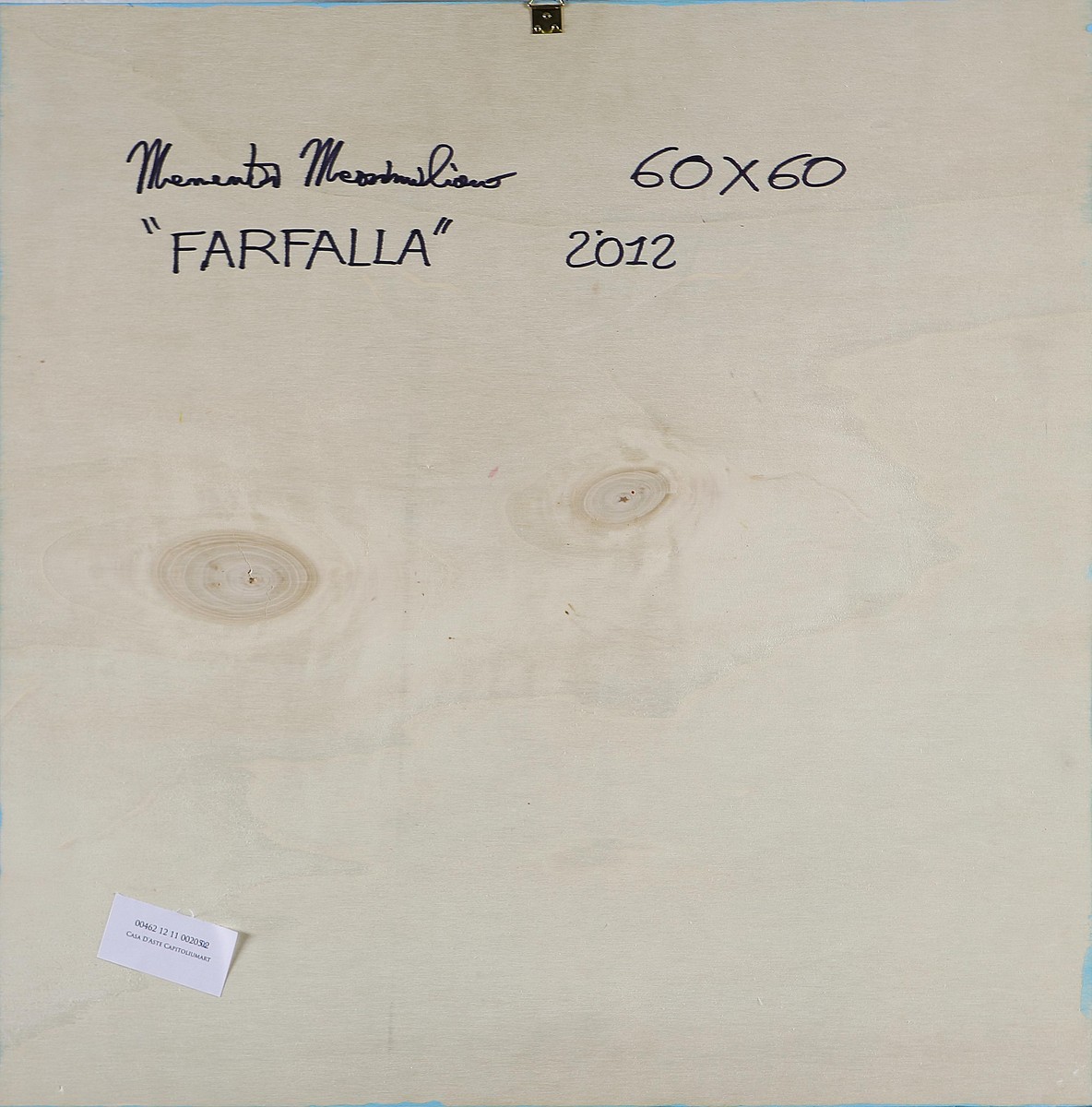MANENTI MASSIMILIANO (n. 1972) Farfalla. Tecnica mista su tavola. Cm 60x60. Autentica dell'artista su fotografia. In allegato all'opera pubblicazione: Massimiliano Manenti, Sostanza della Poesia - Equilibrio della forma, 2012. Al retro firma, data, misure, titolo.