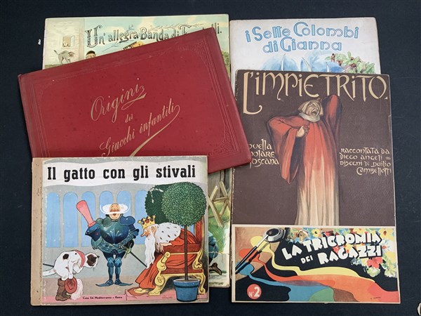 [GIOCHI]. Lotto composto da vari libri del XIX e XX secolo sulle favole e i giochi per bambini. SI SEGNALA: CRESPI Gaetano. Origini dei giuochi infantili. Milano: Marchi, 1890. 8vo, legatura in velluto rosso con titolo in oro al piatto. Non collazionato e difetti da esaminare.
