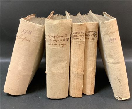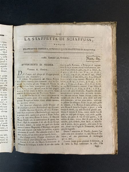 [GIORNALI - GAZZETTE DI SCIAFFUSA] - I compilatori dell'antica staffetta di Sciaffusa, ovvero Traduzione delle gazzette di Sciaffusa. Milano: Veladini, 1788-1791. 5 volumi contenenti tutti i numeri del periodico bisettimanale rilegati in cartone coevo e in barbe. Il periodico era caratterizzato da tendenze antifrancesi e antirivoluzionarie (Mena, p. 110). Non collazionato e difetti da esaminare.