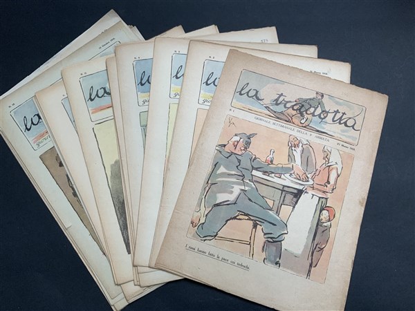 [GIORNALI - LA TRADOTTA - I primi 24 numeri del celebre giornale della Prima Guerra Mondiale, insieme a un disegno preparatorio e ai 3 Supplementi al n. 18. 1918-1919. Oltre ad Enrico Sacchetti, animatore della rivista ed autore della testata e di tutte le copertine a colori, figurano tra i collaboratori: A. Rubino, G. Mazzoni, U. Brunelleschi etc. Non collazionato e difetti da esaminare.