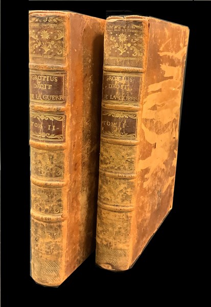 GROZIO, Ugo. Le droit de la guerre et de la paix. Nouvelle Traduction par Jean Barbeyrac. Basilea: Emanuel Thourneisen, 1746. 2 volumi, 8vo. Ritratto in antiporta, frontespizi in rosso e nero (alcune bruniture). Pelle coeva, dorsi dorati e tagli rossi (difetti). Non collazionato e difetti da esaminare.