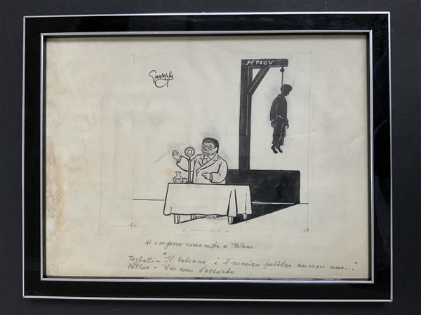 GUARESCHI Giovannino (1908-1968) "Al Congresso comunista a Milano" c.a 1947. (220x300 mm) Disegno a china originale a china originale entro cornice. Probabile bozza per la rivista "il Candido" che allude all'omertà di Togliatti e il Partito comunista Italiani nei confronti dei crimini sovietici, qui nello specifico rappresentati dalll'impiccagione di Nikola Petkov, politico bulgaro giustiziato il 18 Settembre 1947