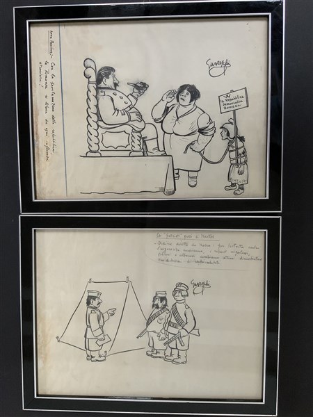 GUARESCHI Giovannino (1908-1968) 2 Disegni: "W la Repubblica democratica rumena" "Coi patrioti greci di Markos" .Lotto di due disegni a china originali entro cornice (220x300 mm) Lotto di due bozze per illustrazioni per la rivista il Candido che ironizzano su Anna Pauker, segretaria del partito comunista rumeno e fedele stalinista e Markos Vafeiadis, primo ministro del governo provvisorio comunista greco. c.a 1947-48