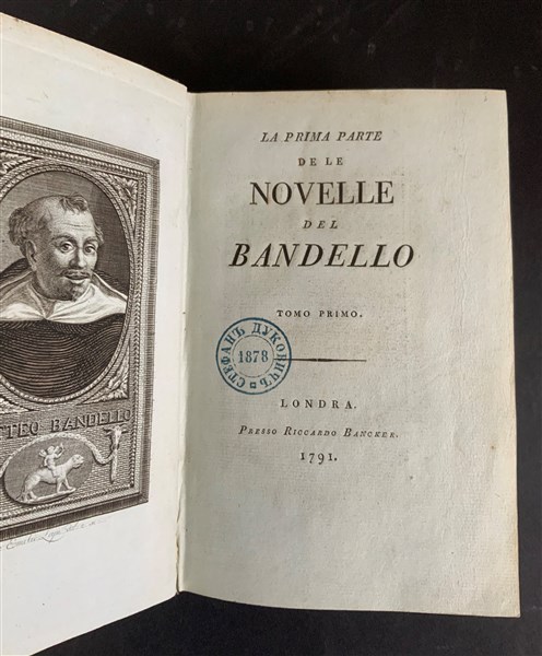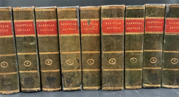 [LEGATURA] - BANDELLO, Matteo. La prima (-quarta) parte de le novelle. Tomo primo (-nono). Londra i.e. Livorno]: Presso Riccardo Bancker i.e. Tommaso Masi], 1791-93. 9 volumi in 8vo. Ritratto dell'Autore in antiporta disegnato e inciso da Angelo Emilio Lapi. Più di una carta anteposta dal legatore, una carta slegata nell'ultimo volume ma esemplare ben completo, stampato su carta forte azzurrina e ad ampi margini. Legatura coeva in mezza pelle verde con punte e piatti rivestiti in carta marmorizzata, titoli impressi in oro su tasselli al dorso (difetti alle cerniere di qualche volume, piccoli interventi di restauro ad alcuni dorsi e altri segni del tempo. Timbro di possesso in cirillico ai frontespizi). Non collazionato e difetti da esaminare.