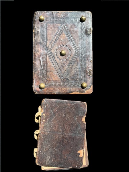 [LEGATURA] Bel lotto di 2 legature su assi di legno: 1] Legatura sec XV. piena pelle su assi di legno, presente nervatura, dorso assente. 2] Legatura prima meta sec. XVI. Piena pelle su assi in legno, 5 borchie in ottone ai piatti, ricca decorazione impressa a secco ai piatti, mancante dei fermagli in ottone. (difetti)