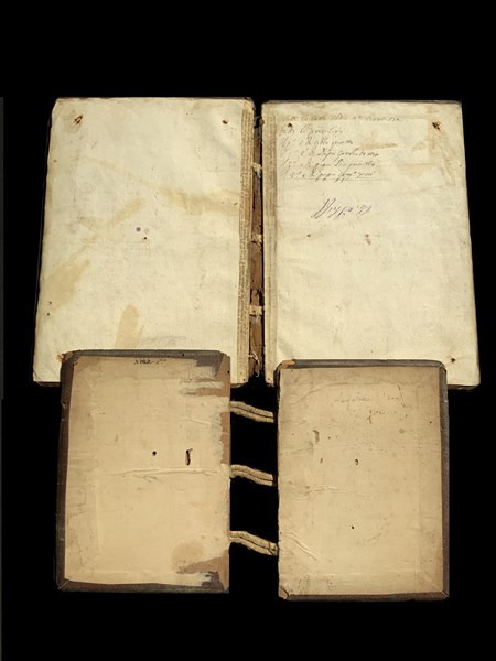 [LEGATURA] Bel lotto di 2 legature su assi di legno: 1] Legatura sec XV. piena
