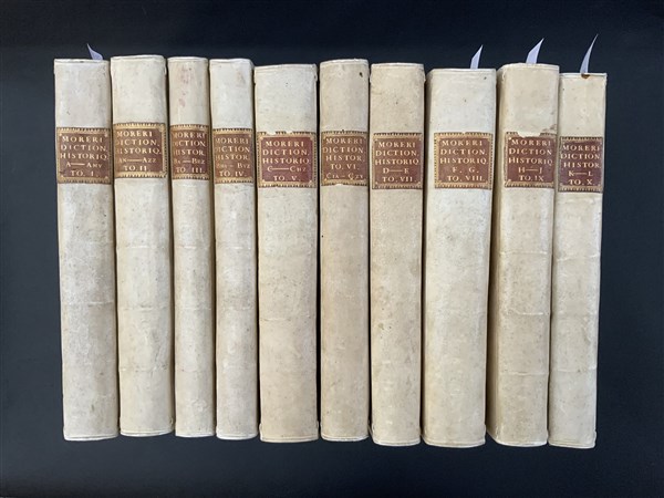 [LEGATURA] MORERI Louis. Le grand dictionnaire historique ou le melange curieux de l'histoire sacree et profane. Parigi: Francois Pitteri, 1743. 10 vol, 4to, antiporta al primo volume. Bella legatura coeva in piena pergamena con titolo in oro su tassello al dorso, tagli a spruzzo. Non collazionato e difetti da esaminare.