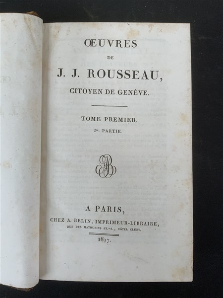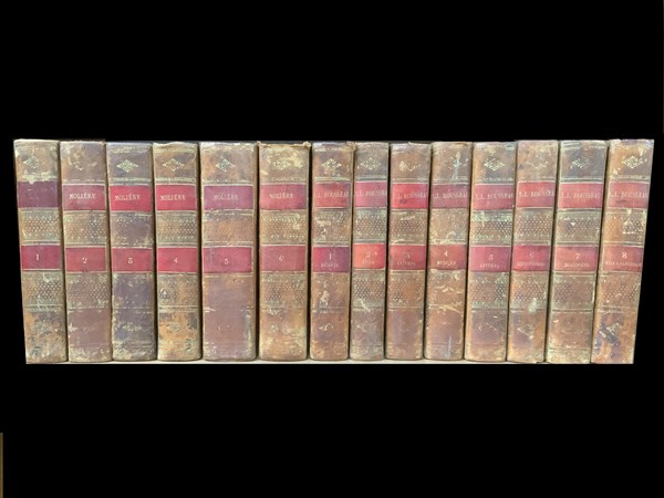 [LEGATURA] MOLIERE Oeuvres. Parigi: Compagnie des libraires associés, 1804. 8vo, 6 volumi. Legature coeva in vitello spugnato rosso con tagli marmorizzati [CON:] ROUSSEAU Oeuvres. Parigi: Belin, 1817. 8vo, 8 volumi Legature coeva in vitello spugnato rosso con tagli marmorizzati. Non collazionato e difetti da esaminare.