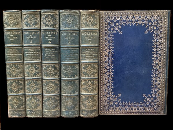 [LEGATURA] MOLIERE. Dramatic works. Edimburgo: Paterson 1875. 8vo, 6 voll, numerose tavole. Bella legatura in marocchino blu e decori in oro al dorso e ai piatti firmata da Andrew Grieve. Non collazionato e difetti da esaminare.