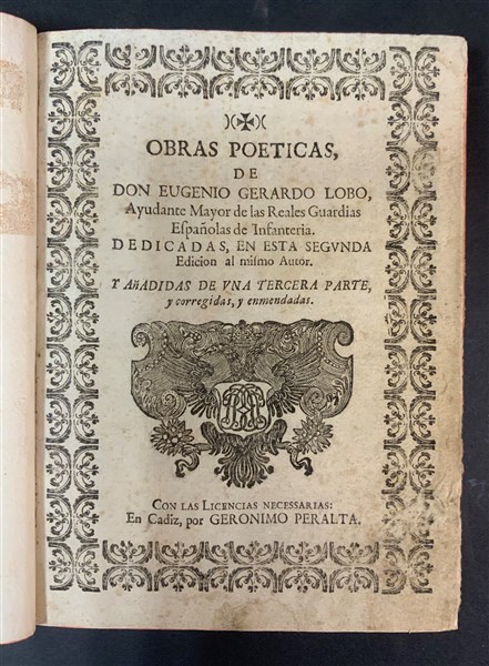 Lotto 2787 | LOBO, Gerardo. Obras Poeticas. Cadice: Geronimo Peralta, s.d. Frontespizio entr