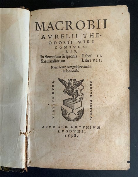 MACROBIO. In somnium scipionis libri II, Saturnaliorum libri VII. Lione: Grifo, 1538. 8vo, illustrazioni xilografiche nel testo (lievi bruniture) Legatura in mezza pelle con piatti marmorizzati e titoli impressi in oro al dorso. Bella edizione delle opere di Macrobio