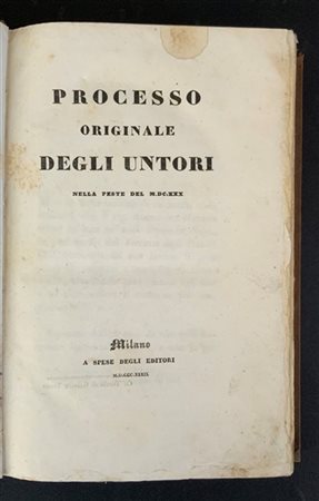 [MANZONI] Processo originale degli untori nella peste del 1630. Milano: Truffi, 1839. 8vo, 1 tavola ripiegata. Legatura coeva in tela e titolo in oro al dorso. Prima edizione di questa raccolta di documenti storici relativi alla peste di Milano (1630); In primis gli atti del processo controi presunti untori. La grande tavola ripiegata raffigura i supplizi inferti agli accusati in piazza Vetra dove venne poi eretta la celebre "Colonna infame", visibile in basso a destra. Non collazionato e difetti da esaminare.