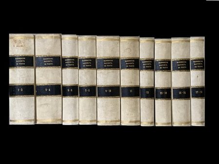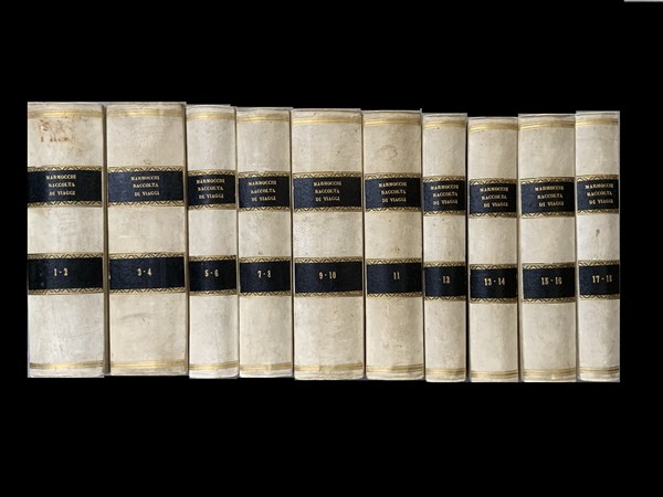 MARMOCCHI, Francesco. Raccolta di viaggi dalla scoperta del nuovo continente fino a' dì nostri. Prato: Fratelli Gachetti, 1840-45. 18 tomi in 10 volumi in mezza pergamena coeva con titoli su etichette al dorso. Numerosissime tavole incise. Non collazionato e difetti da esaminare.