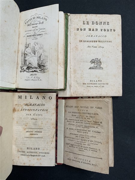 [MILANO - ALMANACCHI] Lotto di 4 almanacchi milanesi: Le donne non han torto: almanacco in dialetto milanese per l’anno 1829. Milano: Silvestri CON:] Milano: almanacco storico patrio per l’anno 1822. Milano: Boucher. [CON] BIORCI Domenico. Fasti di Milano dell’anno 1828. Milano: Visaj. Esemplare con dedica dell'autore in legatura coeva E:] Milano all'ospital de pazzi ossia la speranza repubblicana. Italia: Rossi [1799]. Non collazionato e difetti da esaminare.