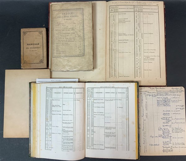 [MILANO - GUIDE NUMERICHE] Lotto dedicato alle guide numeriche di Milano. Nel lotto: Manuale del forestiero. Milano: Pirola, 1864; L'indice della guida numerica. Milano: Tamburini, 1812; Guida ad uso delle II. RR. guardie militari di polizia per la pronta diramazione dei piantoni notturni e diurni. Milano: Truffi, 1844; Numerazione progressiva dell R. città di Milano dell'anno 1828. s.l. e s.d., ma c. 1857]; Nuova guida numerica della città di Milano compilata secondo il piano di numerizzazione. Milano: Pirola, 1839; Quaderno manoscritto del XX secolo con note sulla numerazione delle case e delle cascine del Comune dei Corpi Santi di Milano. Non collazionato e difetti da esaminare.