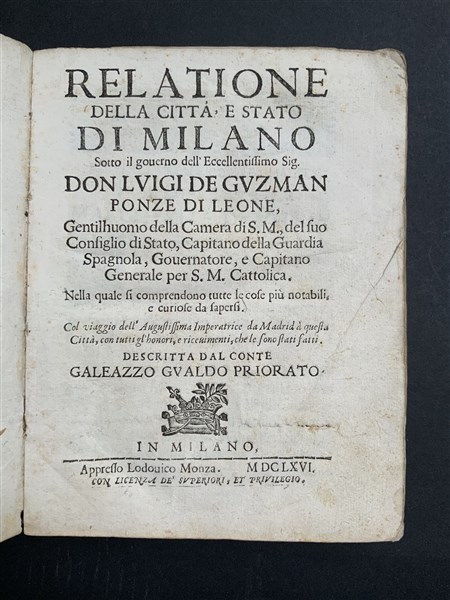 [MILANO] GUALDO PRIORATO, Galeazzo. Relatione della città e stato di Milano. Milano: Monza, 1666. 4to testatine iniziali xilografiche (qualche difetto e macchie, Restauro a carta 22). Legatura coeva in cartonato. Prima edizione della nota storia milanese, manca il ritratto. Non collazionato e difetti da esaminare.