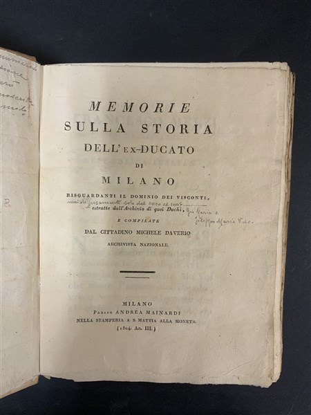 [MILANO] Memorie sulla Storia dell'ex-ducato di Milano. Milano: Andrea Mainardi, 1804. Buona copia in cartone coevo. Non collazionato e difetti da esaminare.