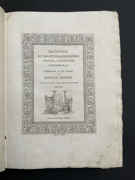 MOSES, Enrico. Raccolta di vasi antichi, altari, patere, tripodi, candelabri, sarcofagi, etc. pubblicati in 170 tavole ; con alcuni cenni storici. Milano: 1824. 4to, qualche tavola a colori (alcune macchie). Cartone editoriale. Non collazionato e difetti da esaminare.