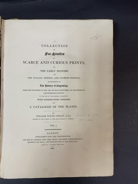 OTTLEY, William Young. A Collection of Fac-Similes of Scarce and Curious Prints, by the Early Masters of the Italian, German, and Flemish Schools. Londra: the Proprietor, sold by Longman, 1826. Folio, numerosissimi facsimili di incisioni inserite nel testo. Mezza pergamena coeva. titolo al dorso e etichetta "volume I" (difetti). Non collazionato e difetti da esaminare.