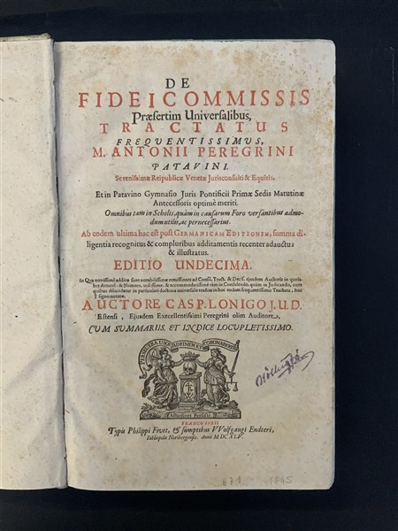 PEREGRINI Antonio. De Fideicommissis paesertim universalibus tractatus. Francoforte: Fivet, 1645. Folio, titolo stampato in rosso e nero, legatura in piena pergamena.