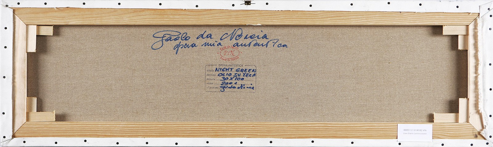DA NORCIA PAOLO (n. 1953) Night green, 2001. Olio su tela. Cm 30x100. Autentica dell'artista su fotografia. Firma in basso a sinistra. Al retro firma per autentica, titolo, data, tecnica, misure e timbro -Paolo da Norcia-.