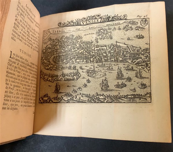 ROGISSART, Alexandre de (attivo dal 1706). Les Délices de l'Italie. Leida: Pierre Vander, 1706. Solo la prima parte, 8vo, pergamena coeva. Antiporta e frontespizio incisi in rame, 44 tavole incise, molte delle quali ripiegate, una contentente una veduta di Venezia e un'altra che illustra il Carnevale. Non collazionato e difetti da esaminare.