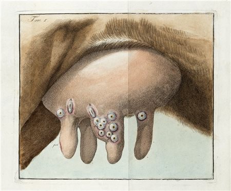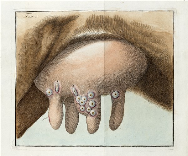 4to (290 x 218mm). Engraved portrait of Jenner by Anderloni, engraved medallions on title and at the beginning of the text, 4 folding hand-coloured engraved plates at end (some occasional light foxing). Contemporary boards backed in vellum, traces of shelfmark (extremities lightly rubbed and light stains). Provenance: Duplicate of the Library in Bergamo (duplicate stamp).