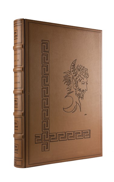 Folio (504 x 348mm). 6 litografie originali firmate a matita da Sassu. Legatura editoriale in carta Zerkall, entro contenitore alla francese in pieno cuoio vegetale con titoli e fregi a secco e a pastello sul dorso e piatti, il tutto a cura di Ennio Torri; entro cartone originale realizzato per la spedizione