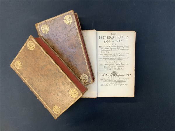 SERVIEZ Jacques Roergas de. Les impératrices romaines. Parigi: Michelle estienne David, 1728. 3 voll, 8vo legature coeve in piene pelle alle armi di Jacques François Léonor Goyon, Principe di Monaco. Non collazionato e difetti da esaminare.