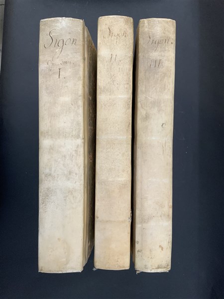 SIGONIO, Carlo. Opera omnia edita ed inedita. Milano: stamperia palatina, 1732. 6 parti in 3 volumi. Ritratto in antiporta, frontespizi in rosso e nero, vignette ai frontespizi, testatine calcografiche e capilettera figurati. Legatura coeva con dorso in pergamena e piatti marmorizzati. Buona copia del celebre storico modenese, precursore del Muratori nell'indagare la storia medievale della penisola. Non collazionato e difetti da esaminare.